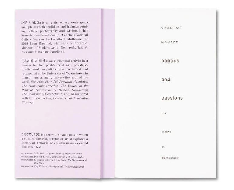 In 2009, the artist Anna Ostoya created a booklet with textual collages using an essay by the political theorist Chantal Mouffe, ‘Politics and Passions: The Stakes of Democracy’ (2002). In the essay, Mouffe critiqued the then-dominant ‘beyond left and right’ politics of neoliberalism and warned of its dangers – the rise of right-wing populist parties. Fascinated by Mouffe’s strikingly prophetic ideas, as well as her bold call to fight the status quo in order to radicalise democracy and to prevent violence, Ostoya returned to the booklet in 2019. She composed for it a series of portraits based on sketches of people on the New York City subway and on reproductions of her paintings and collages from the preceding decade. She also conducted a conversation with Mouffe about the politics of the last forty years, about the contemporary moment and about art, which is included in this publication.