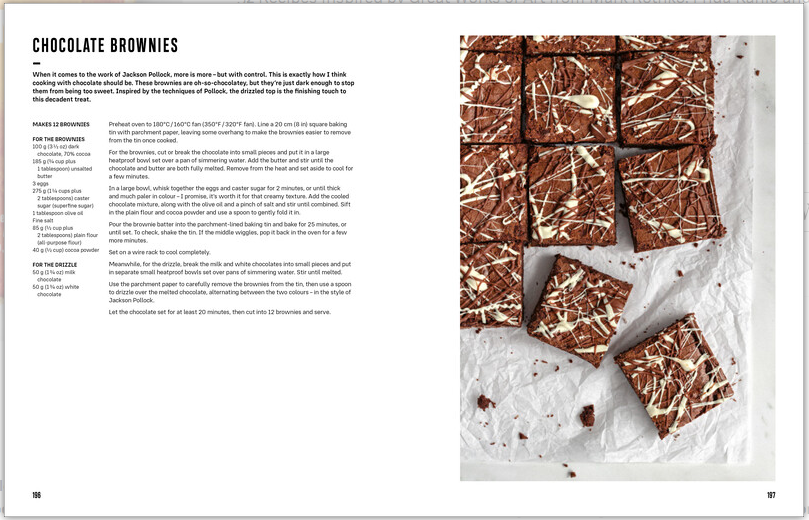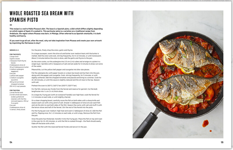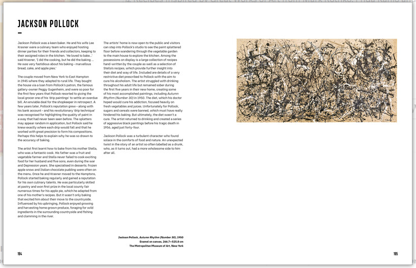 Filled with gorgeous photography, high quality reproductions and fascinating anecdotes, this one-of-a-kind cookbook connects great art with the world of food. To create the recipes in this book Felicity Souter delved into the lives of artists past and present, uncovering fascinating stories, eating habits, and cultural traditions. Each entry consists of an appetizer, main, side, dessert, or drink that visually echoes the artwork and reflects the culinary connection to its artist. More than fifty masterpieces from an enormous array of genres and periods include works by Marina Abramović, Jean-Michel Basquiat, Georgette Chen, Salvador Dalí, Jacob Lawrence, Man Ray, Henri Matisse, Georgia O’Keeffe, and Jackson Pollock. Sumptuous illustrations reveal a striking resemblance between recipe and artwork. An abstract Lee Krasner painting is transformed into a colorful mixed vegetable salad; an oval-shaped Barbara Hepworth sculpture into a crusty loaf of bread; a snowy Monet haystack into a sugar-dusted breakfast muffin; an Yves Klein sponge into an electric blue martini. Easy enough for every day, and aimed at cooks of all abilities, these recipes are themselves works of art, and will whet the creative appetites of readers and chefs alike.