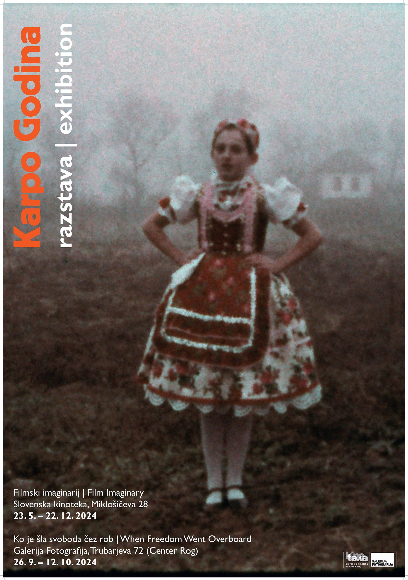 Poster for the exhibition Karpo Godina: Film Imaginary at the Slovenian Cinematheque (2024) and for the exhibition When Freedom Went Overboard at the Galerija Fotografija gallery. Image from the film Imam eno hišo (Imam jednu kuću) (1971).