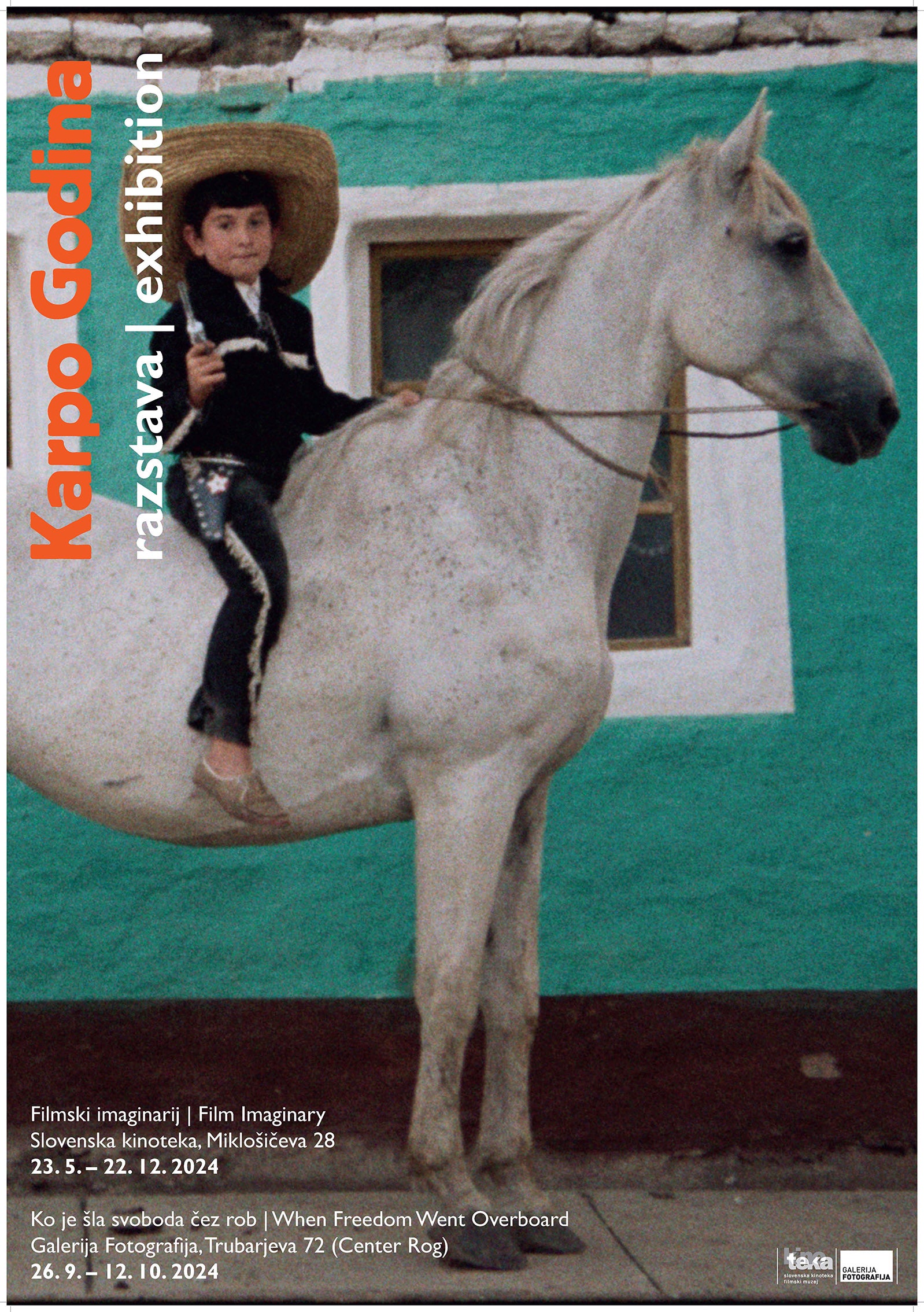 Poster for the exhibition Karpo Godina: Film Imaginary at the Slovenian Cinematheque (2024) and for the exhibition When Freedom Went Overboard at the Galerija Fotografija gallery. Image from the film Litany of Happy People (1971).