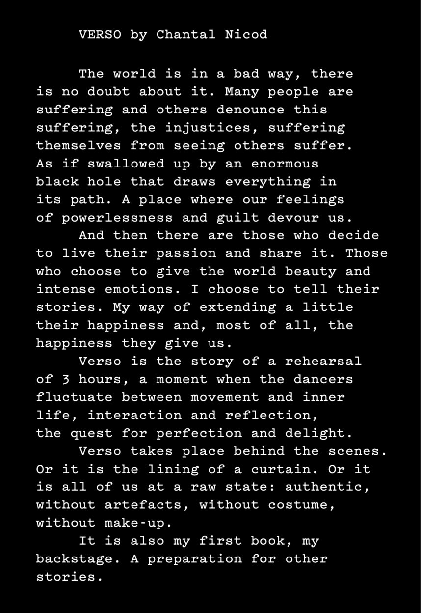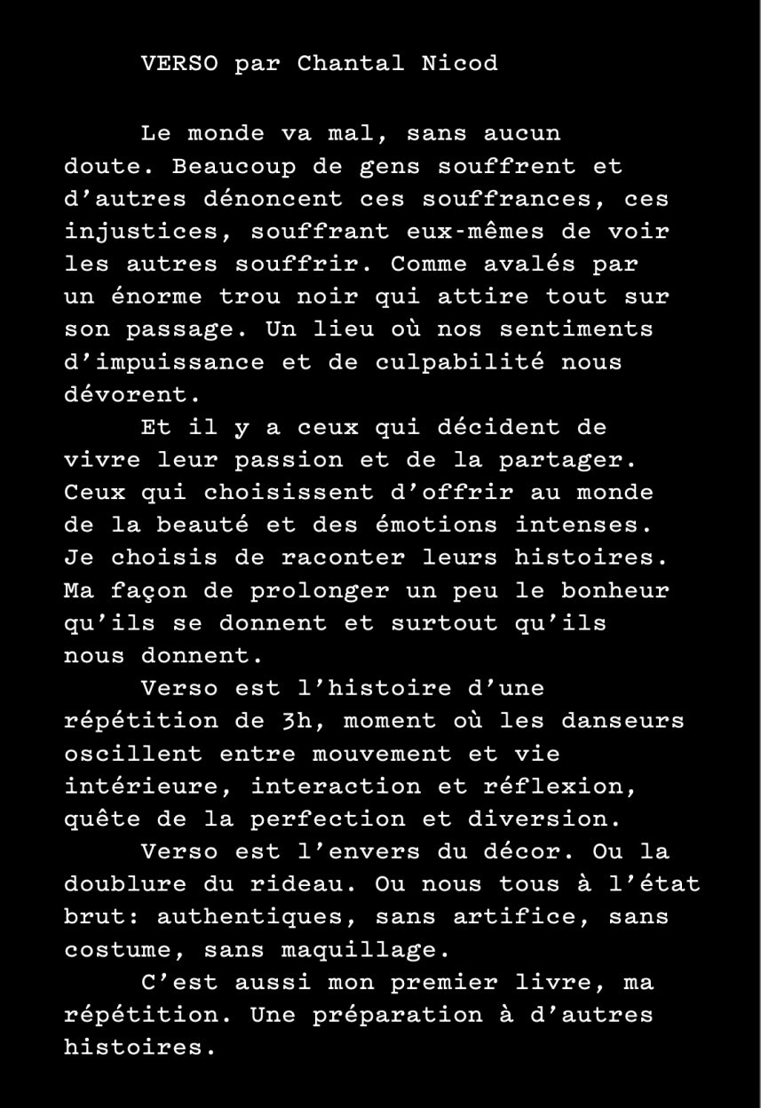 Verso takes place behind the scene. Or it is the lining of a curtain. Or it is all of us at a raw state: authentical, without artefacts, without costume, without make-up.