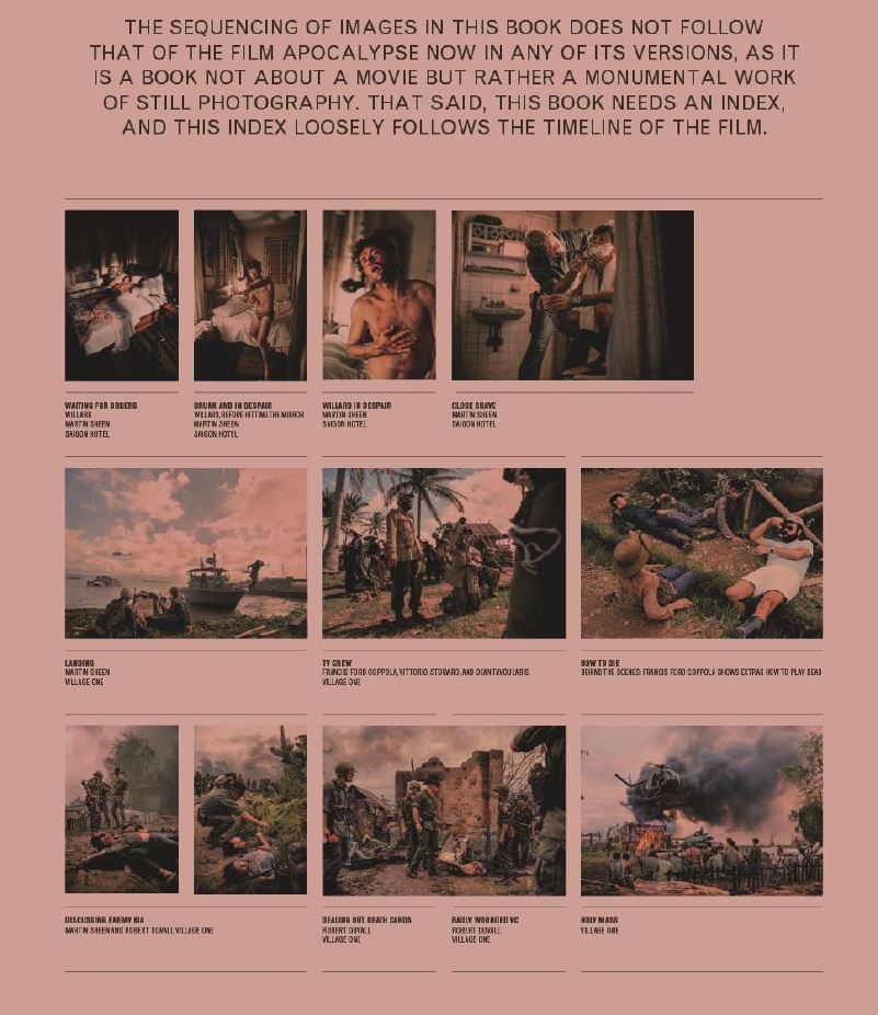 Chas Gerretsen, ki ga je Francis Ford Coppola leta 1976 najel kot fotograf za svojo mojstrovino Apocalypse Now, v svojem zasebnem arhivu s stotinami fotografij bralce takoj popelje v kaos in dramo, ki obdajata enega najpomembnejših filmov vseh časov. Gerretsen je bil znan samostojni fotograf, ki je pred tem delal v Vietnamu, ko ga je poklical Coppola, ki je iskal vojnega fotografa za vojni film. Ker je imel neprimerljiv dostop do zvezdnikov filma, statistov, ekipe in legendarnega dogajanja za kulisami, je šest mesecev preživel na Filipinih in posnel na tisoče fotografij. Te barvne fotografije, izbrane iz tega arhiva, ponujajo intimni vpogled v nemir in vznemirjenje hollywoodskega spektakla, ki se dviga iz nepredvidljivega podnebja filipinskega deževnega gozda. Z zajemanjem zvezdniške moči Marlona Branda, Martina Sheena in Dennisa Hopperja ter razprostranih scenografij nas popelje v lepoto jugovzhodnoazijske džungle in nam pokaže, kako so bili njeni prebivalci vključeni v snemanje. V knjigi so Gerretsenove pronicljive refleksije o njegovih izkušnjah na snemalnem prizorišču enako fascinantne kot njegove fotografije. Medtem ko Apocalypse Now ostaja eden najbolj kritiško priznanih filmov vseh časov, je njegovo nastajanje enako legendarno. Skoraj petdeset let pozneje nas Gerretsenove fotografije spominjajo na Coppolove umetniške dosežke in na ključno obdobje v ameriški kulturni zgodovini.